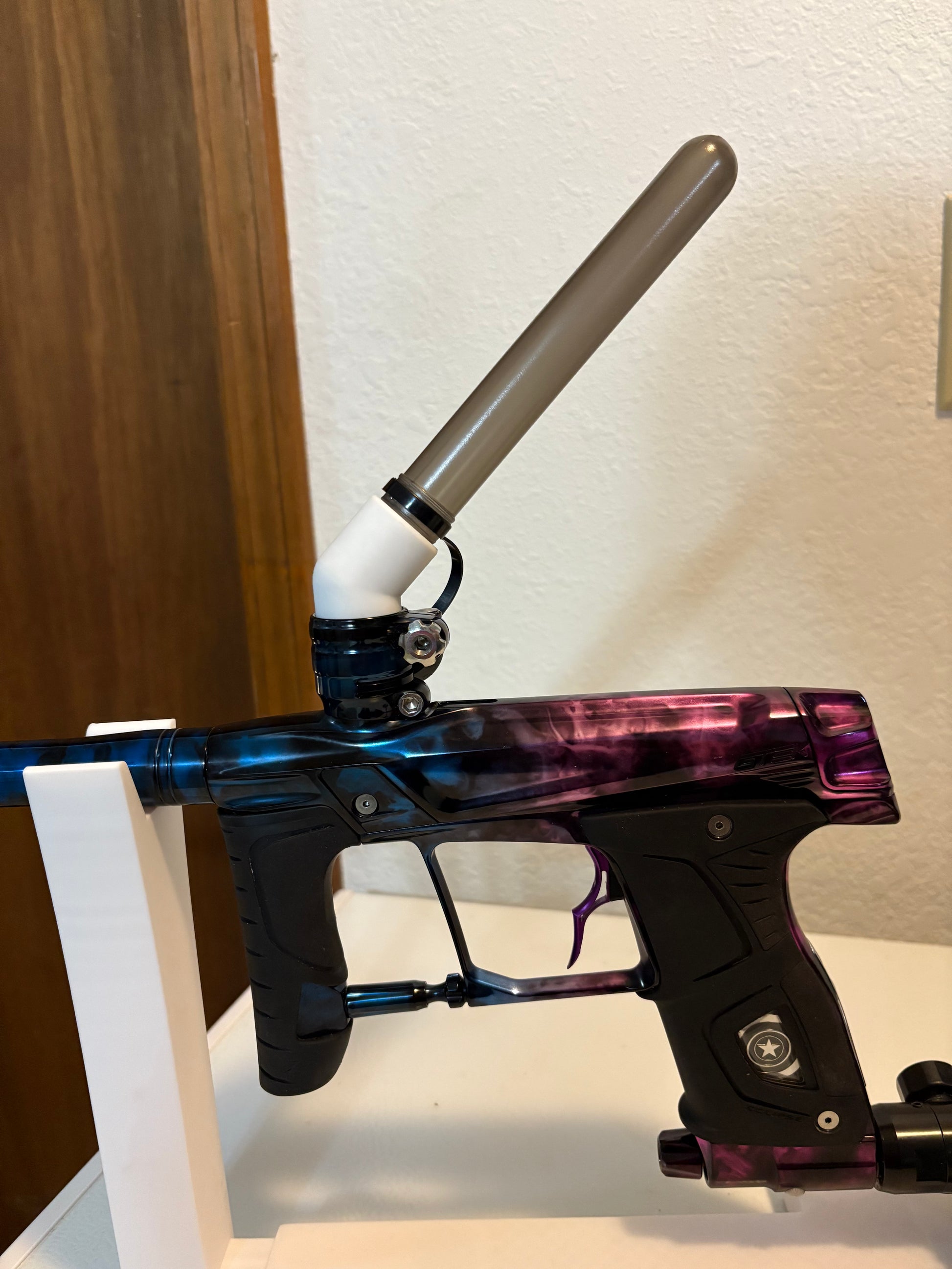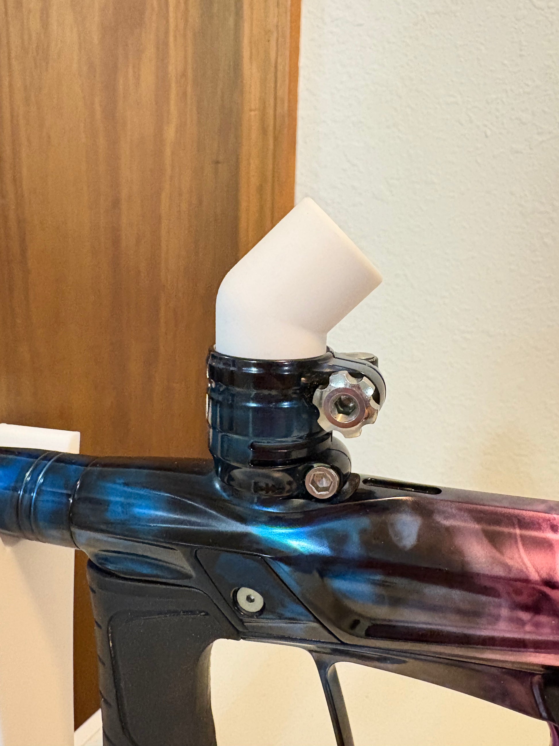 Designed to work with most any clamping feed neck, this elbow will keep a firm grip on the 10rd tube, yet allows for quick reloads to get you back on target quicker. Unlike a straight vertical design, the angle keeps a low, sleek profile while the angle keeps the paint rolling after every shot!! Don’t see a color you like, shoot us an email, we can make it!